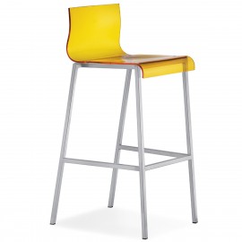 Disponible dans divers coloris translucides, le tabouret Kuadra a la coque fixée à la structure avec des plaques en acier visibles qui insistent sur le contraste entre évanescence et solidité. La structure est en tube d’acier à section carrée.